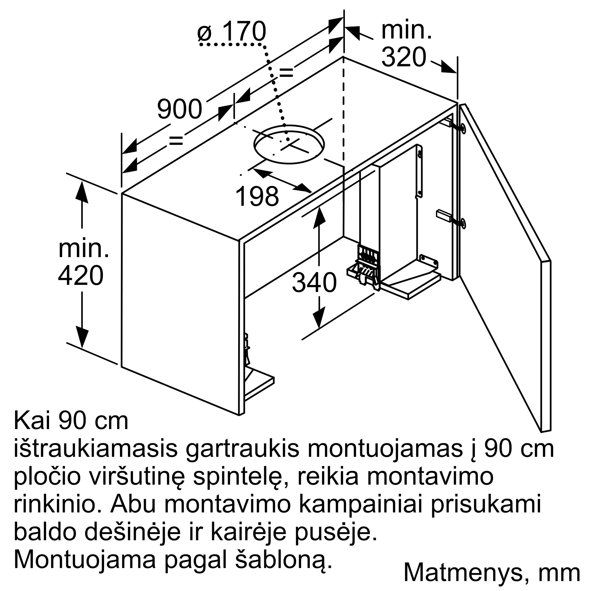 90 cm pločio, plokščio dizaino garų surinktuvas montuojamas 90 cm pločio pakabinamoje spintelėje.