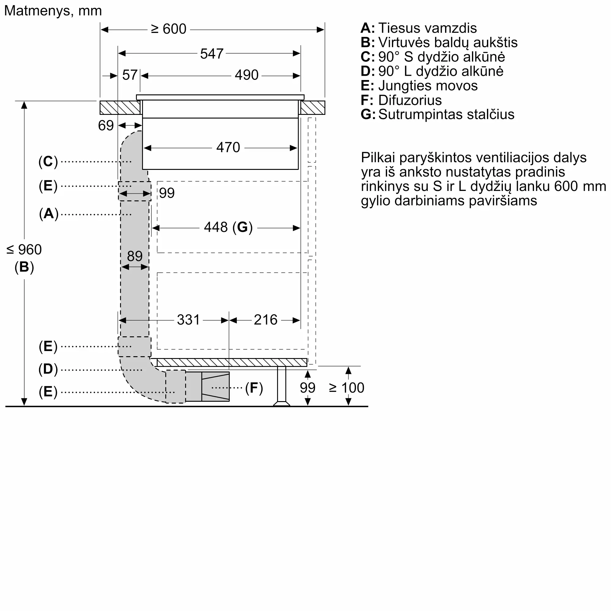 Elementus galima montuoti, kai stalviršio aukštis yra iki 960 mm.